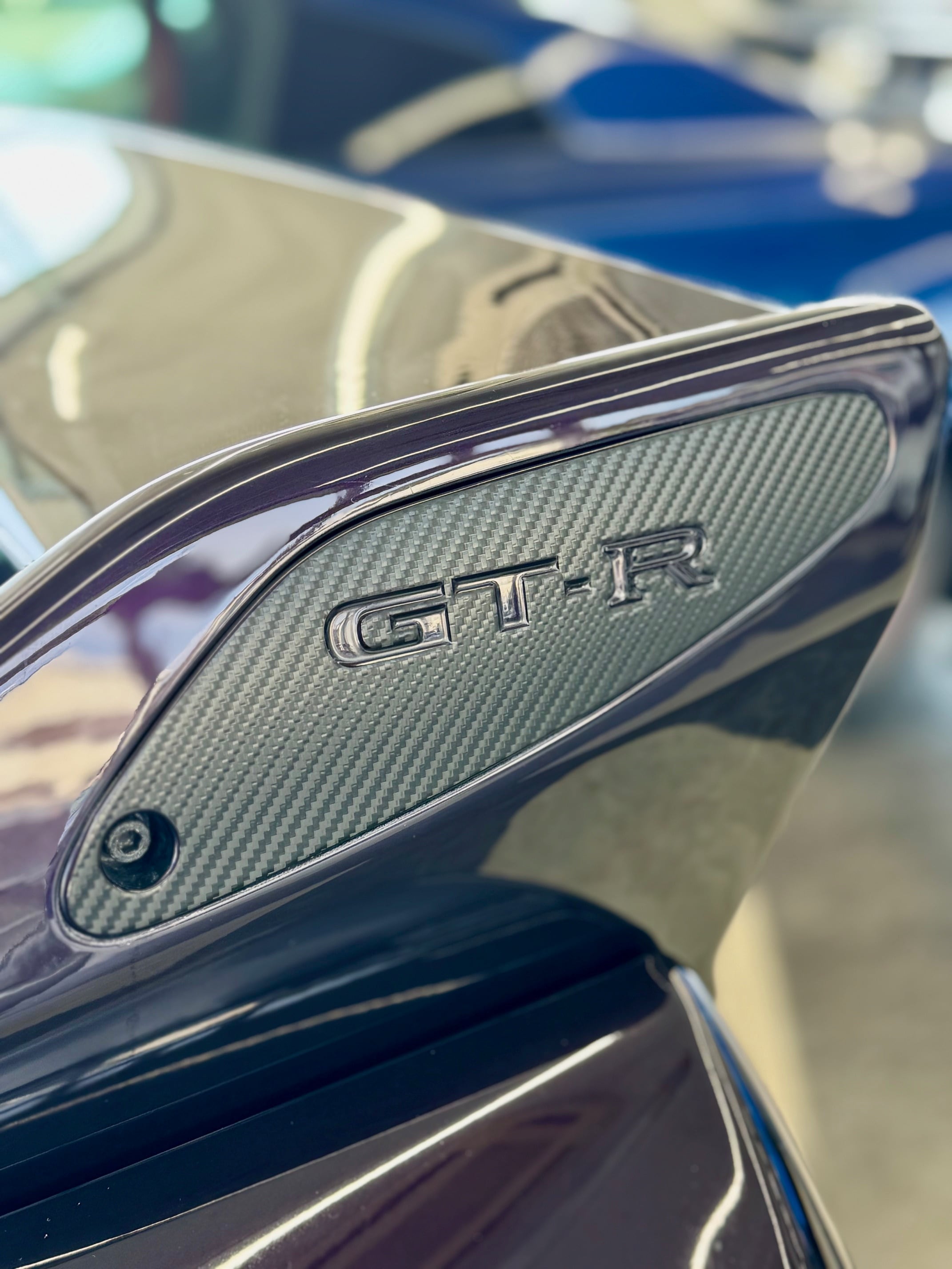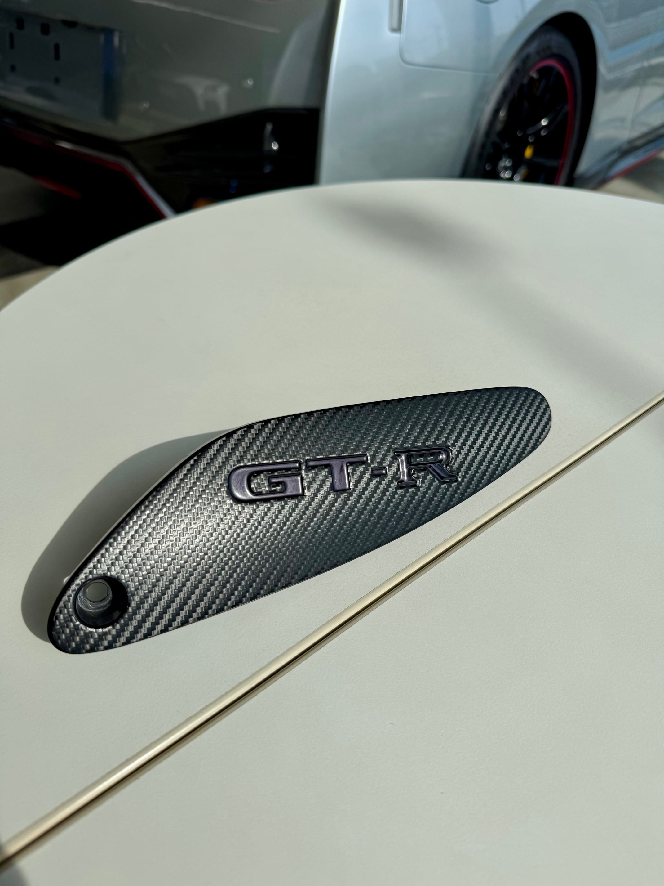 BCNR33 GTR リヤウイングサイドカバー カーボンシートステッカー 左側にはGTRロゴを切り抜いてあります。※右はカーボン柄のみです。 カバーの形状に合わせてカットしてありますので施工も簡単 3Mラッピングシートを使用